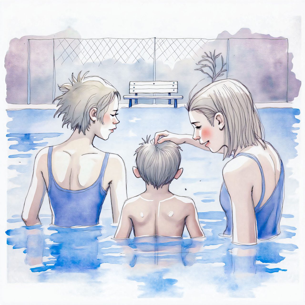 The artwork portrays a striking and emotionally charged moment at a swimming pool. At its center is an anxious young boy as he is reluctantly pushed underwater by two teenage swimming instructors. The teens, clearly inexperienced and lacking empathy, are depicted showing amusement and indifference.