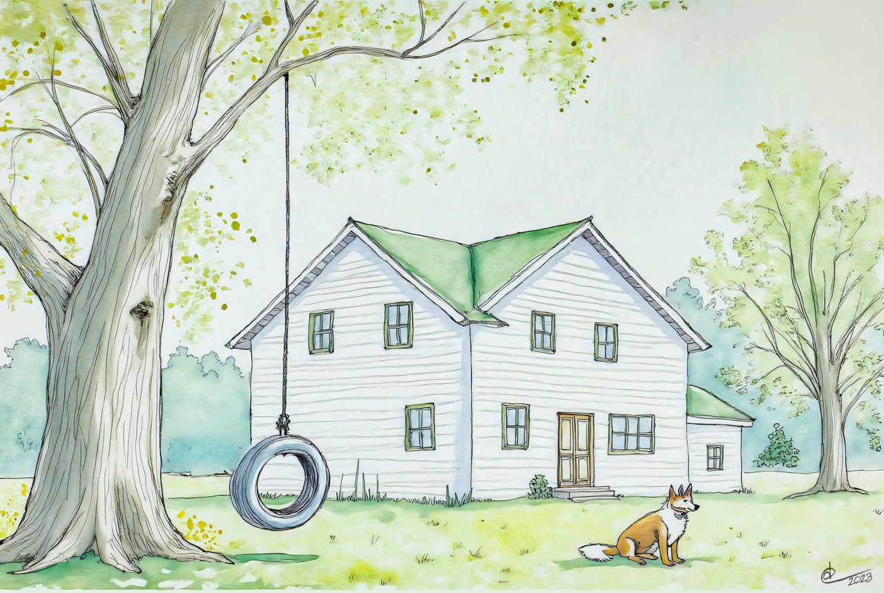 This mixed-media piece, created with ink and watercolor, depicts the farmstead I called home as a small child. It’s fascinating how the details of a place you knew at five years old can blur over time, but my initial sketches for this piece weren’t far off. The only detail I misremembered were the number of windows on the house. Eventually, I found an old photograph tucked away in some family tree files, which allowed me to accurately capture the house’s features.